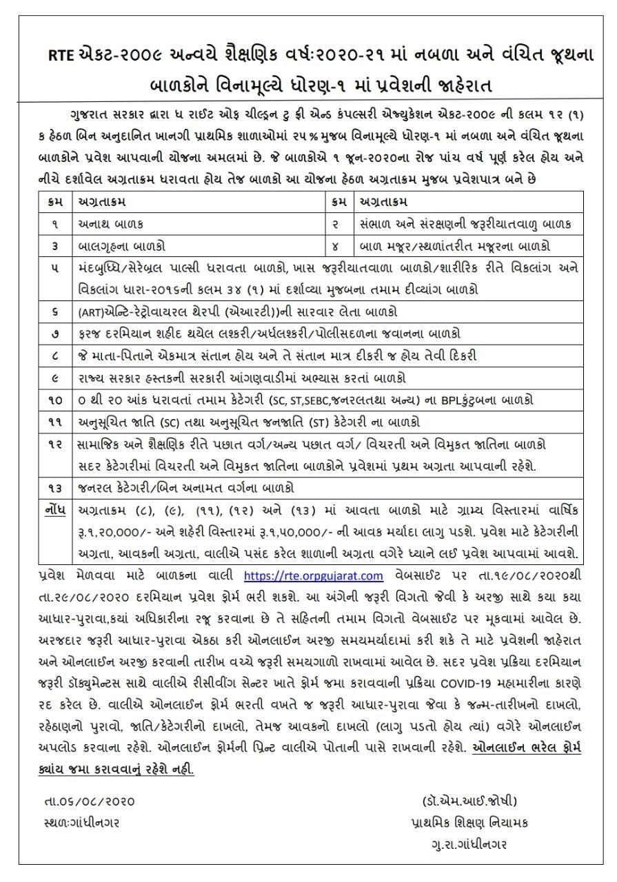 RTE Gujarat Admission: Government of Gujarat, Education Department released notification regarding admission in standard-1 as per Right to Education norms. Subsequently, all the selected students will get 25% reservation in admission in various schools of Gujarat. Eligible and interested applicants may read full advertisement carefully and apply online RTE Gujarat Admission 2020-20- www.rtegujarat.org